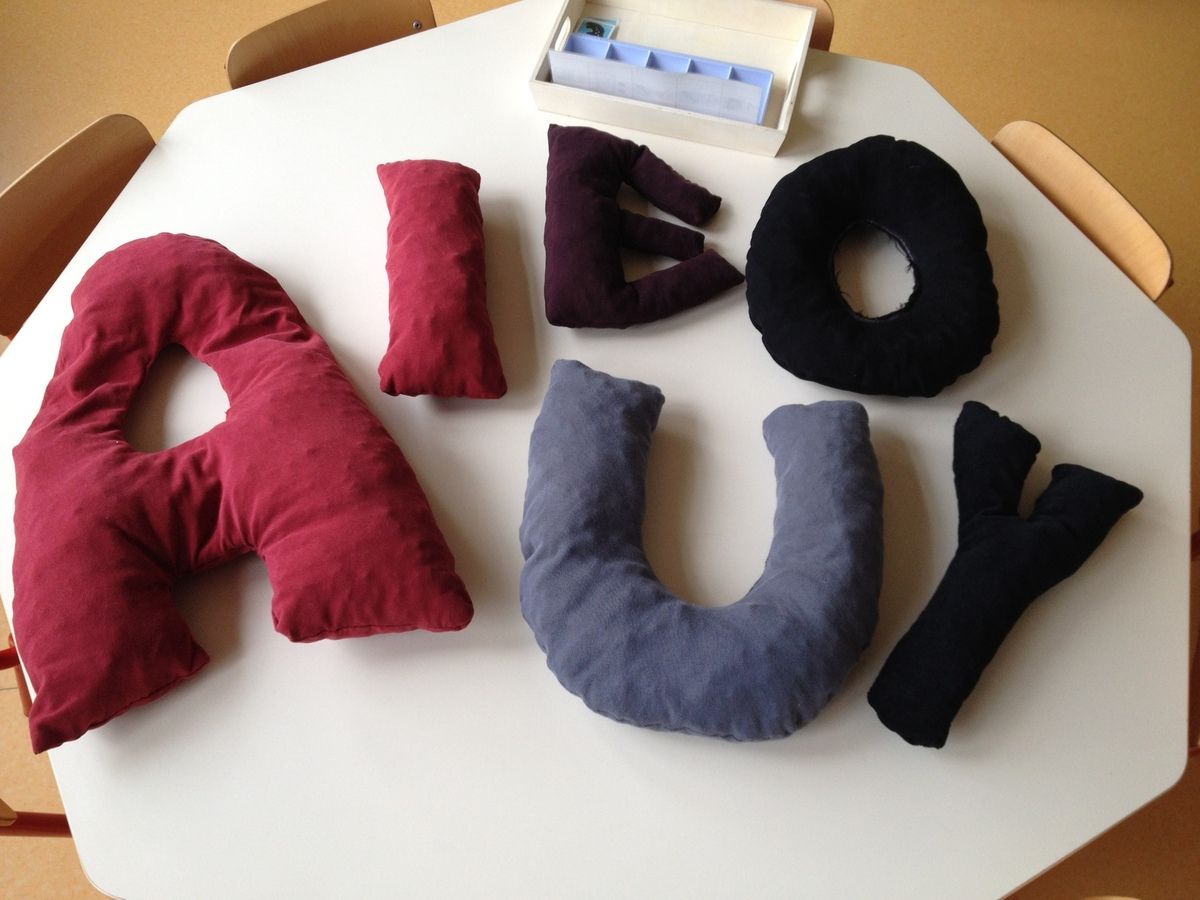 POur compléter, j'ai cousu de grosses lettres en tissu avec des vieux vêtements. Ils les prennent et jouent avec et me les montrent en les nommant. Parfois il faut décripter: